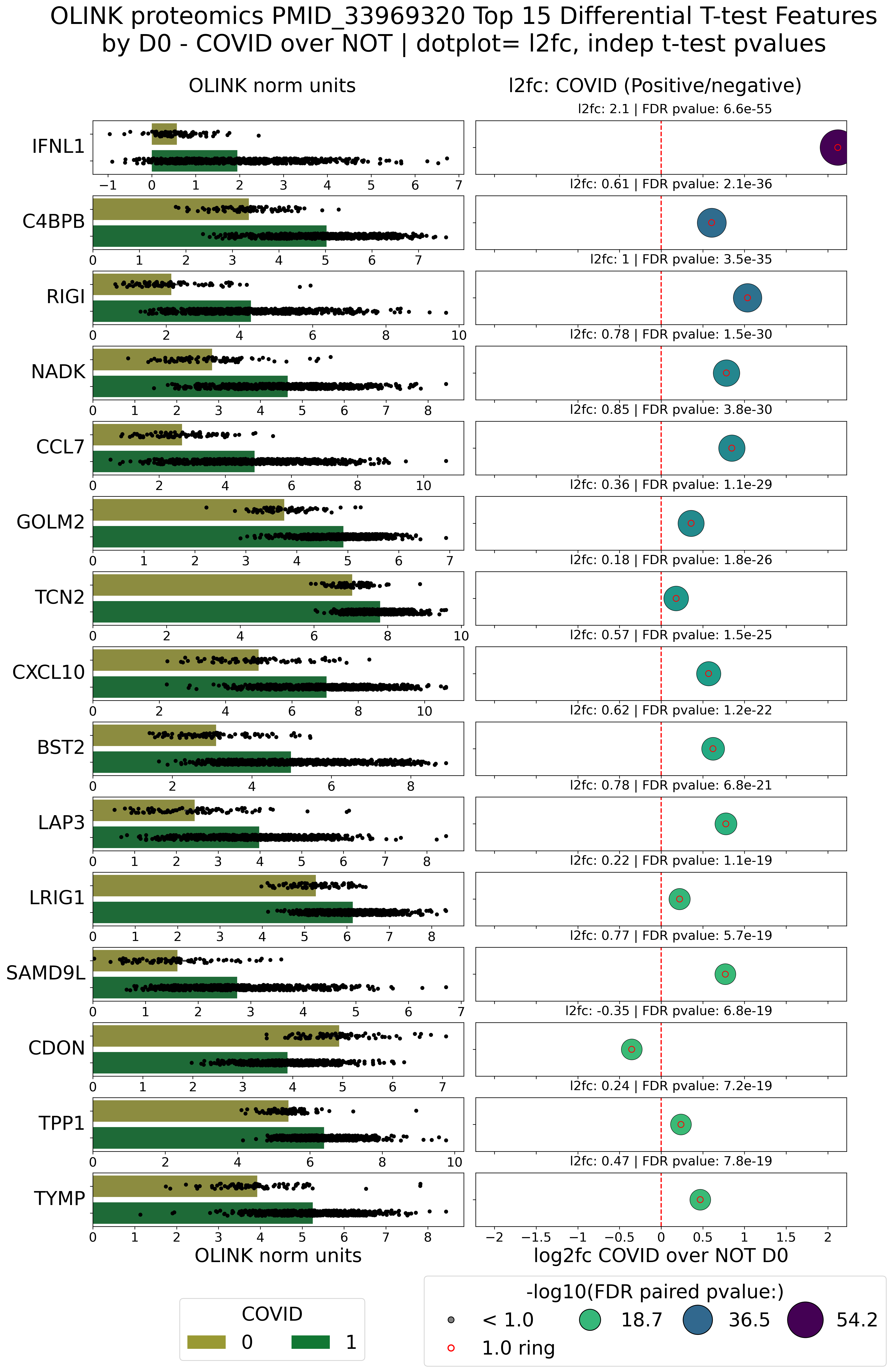 Combined bar and dotplot showing per-feature OLINK distributions alongside log2 fold-change with FDR-scaled dot sizes. Data from PMID 33969320.