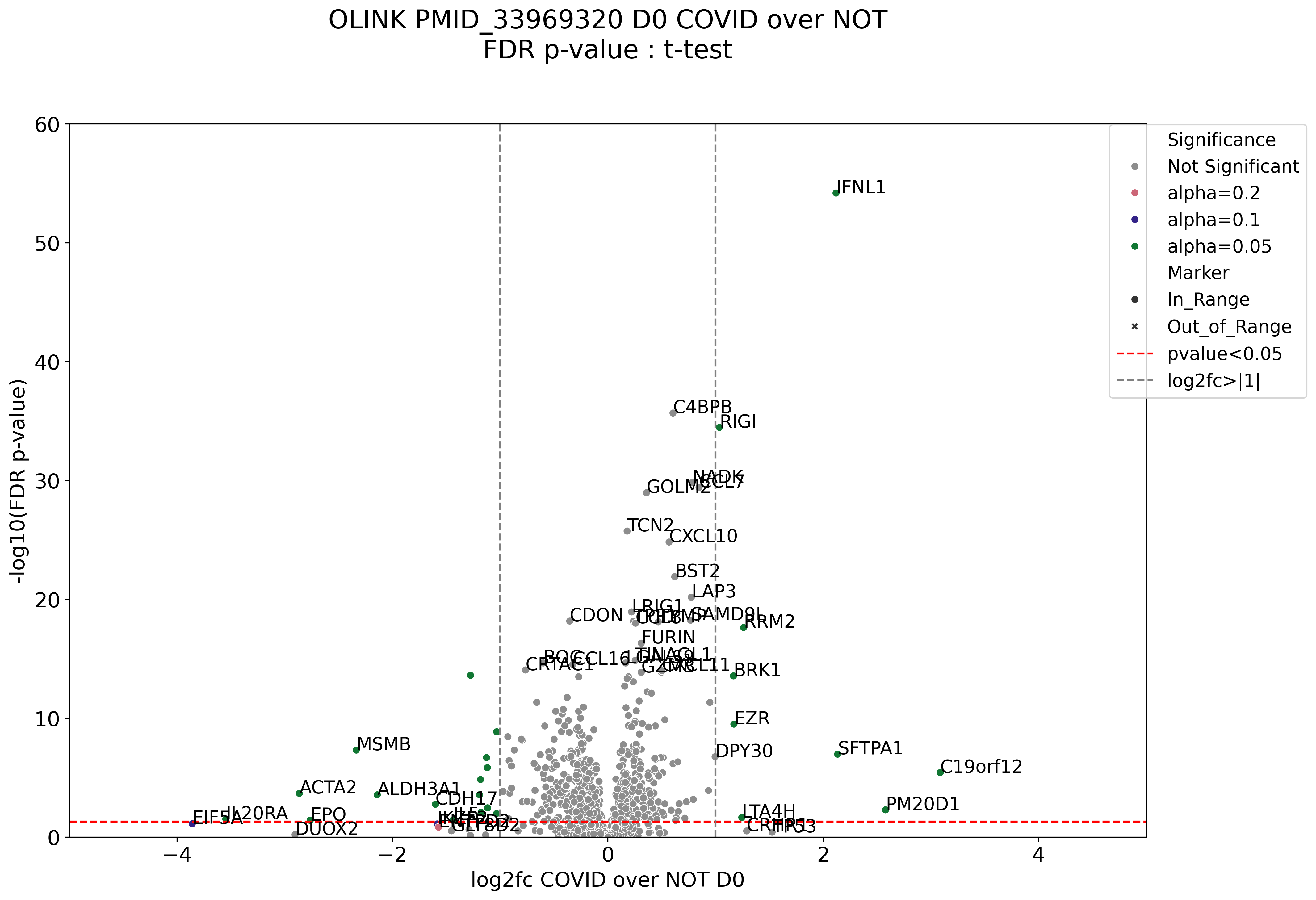 Volcano plot with multi-level significance coloring (alpha 0.2, 0.1, 0.05) and log2FC threshold lines. FDR-corrected t-test p-values.